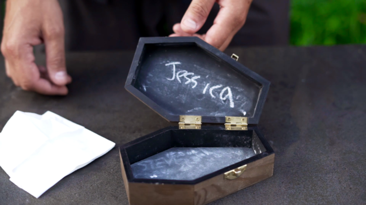 - Vous invoquez les esprits, puis vous ouvrez le cercueil pour révéler le nom de votre spectateur griffonné à la craie sur le couvercle.