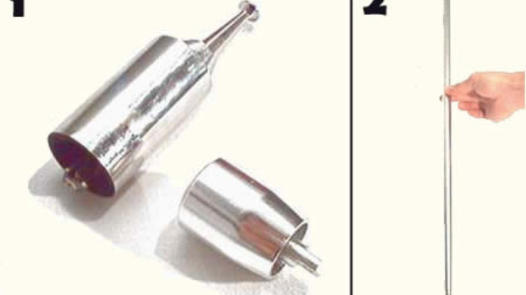 Le magicien montre une canne au public. Après l’avoir fait tournoyer entre ses doigts et tapée par terre pour prouver qu’elle est solide il la transforme en deux foulards.