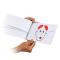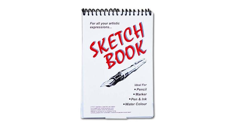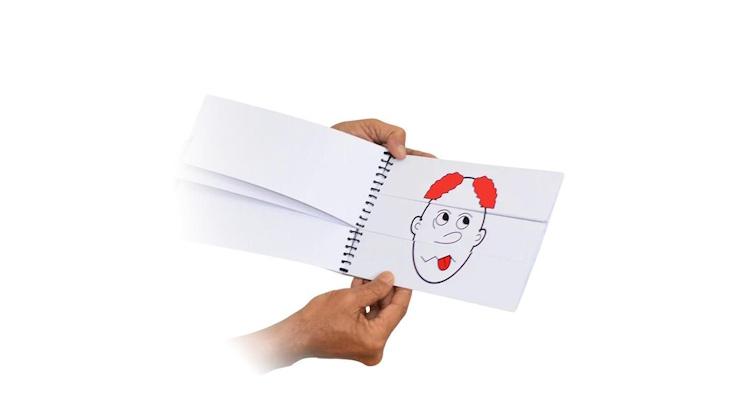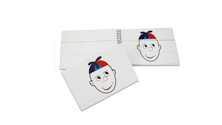 Le magicien présente un bloc à spirale composé de trois piles distinctes de feuilles : l’une contient des dizaines de chapeaux différents, une autre propose de nombreuses expressions faciales, et la dernière présente une variété de bouches.