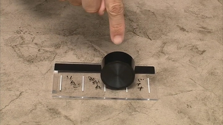 Le magicien montre un tableau transparent sur lequel sont inscrits quatre fruits différents. Un spectateur est invité à choisir l’un des fruits et à le cacher. Le tableau transparent est incliné pour former une rampe. Le magicien place un cylindre noir en haut de la rampe, et celui-ci roule lentement vers le bas. Cependant, le cylindre s’arrête mystérieusement lorsqu’il atteint le fruit choisi !